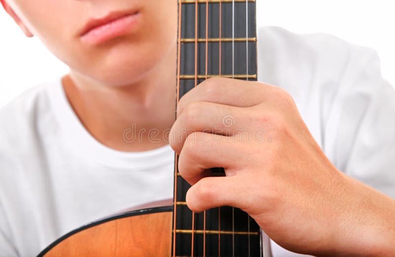 Jugendlicher mit Gitarren-Nahaufnahme. Jugendlicher mit Akustikgitarre auf der weißen Hintergrund-Nahaufnahme