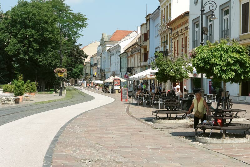Straße in Košice. Zentrale Straße und Garten in der Stadt Košice, Slowakei